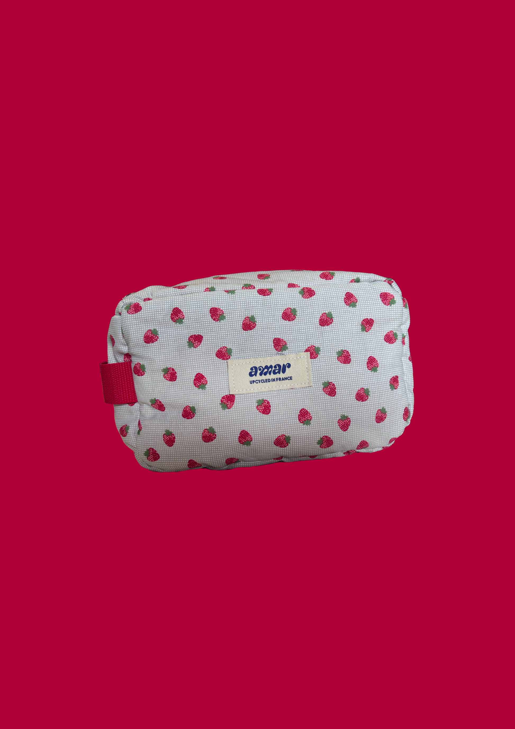 Fabriquée à partir de tissus upcyclés et rembourrée avec de la ouate en coton, elle est parfaite pour ranger vos essentiels de voyage ou votre maquillage.